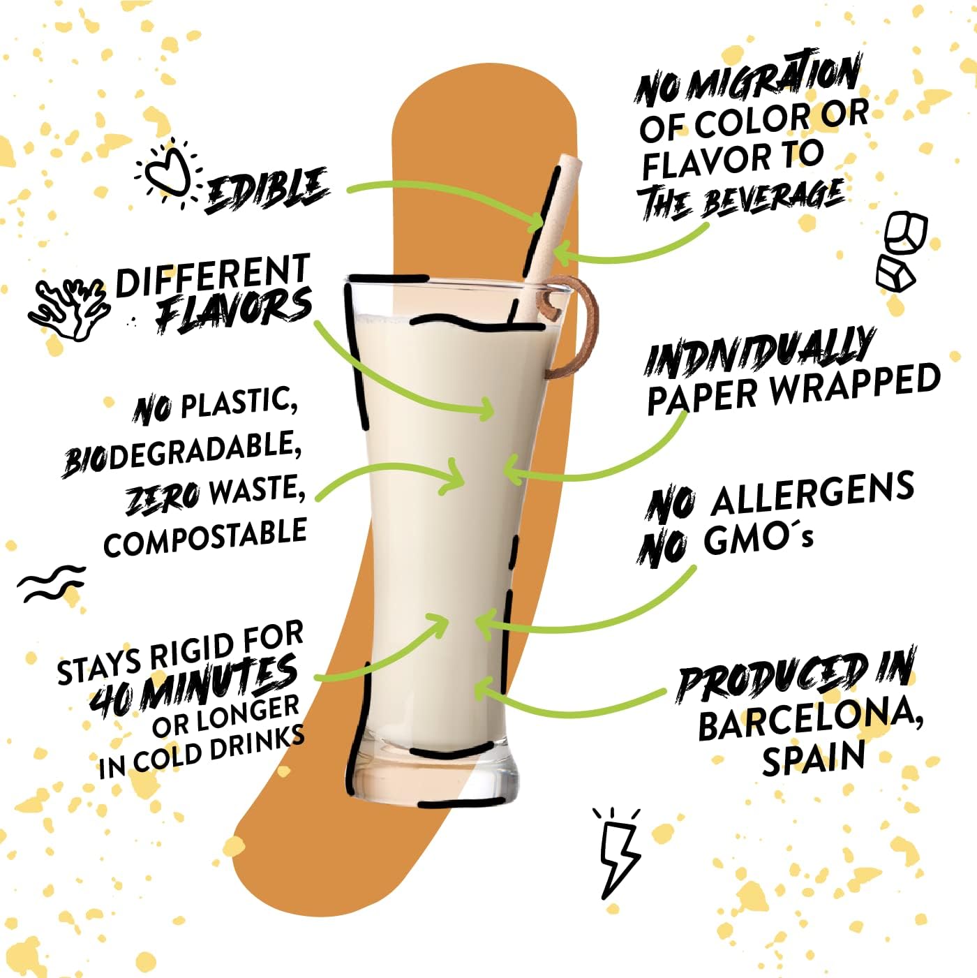Warm and aromatic, the cinnamon-flavored straw adds a hint of spice and depth to every sip. A perfect match for spiced cocktails, chai lattes, and seasonal drinks.